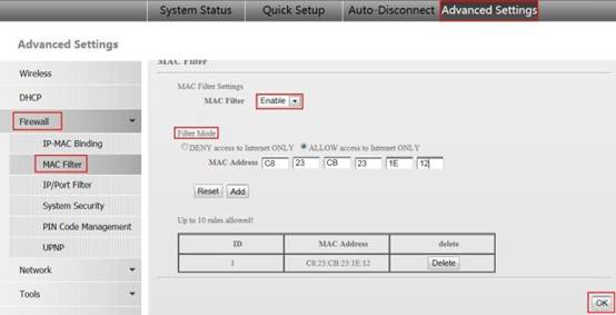 2. Advanced SettingsàFirewallàMAC Filter. Enable