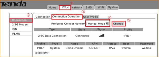 I.Click WAN > Connection > Connection Operation > select Manual Mode and click Change;