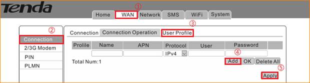 II.Select WAN > Connection > User Profile, click Add to configure the Name, APN, Protocol, User, password (If you cannot locate this information, contact your service provider), then click OK and Apply.