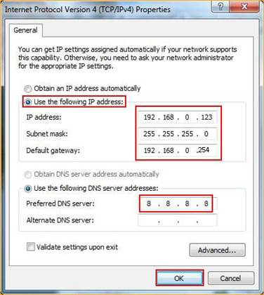 5 Choose Use the following IP address and Use the following DNS server address and then click OK.