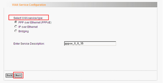 8. In the WAN Service configure page, please select the correct WAN service type and click Next.