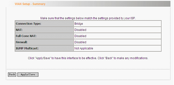 8.3 For Bridge. Click Apply/Save to save your settings in this following page.