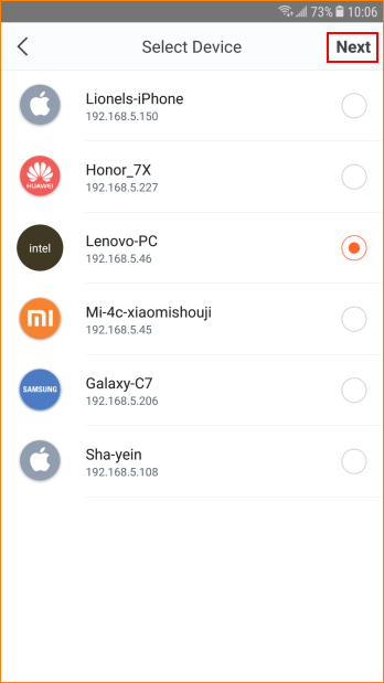 Step 2: Select device and tap “Next”