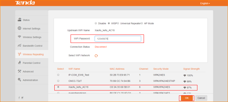 Step4: Select “Upstream WiFi Name”, type password in “WiFi Password”, click “OK” to save all the settings.