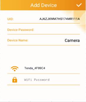 Run TendaCamera APP , click “+” icon of Device, then click WiFi SmartConfig button to scan the QR Code of camera .Then in device password field input the initial password “admin” and in WiFi password field input the Router's wireless password .click "√"to finish adding camera.
