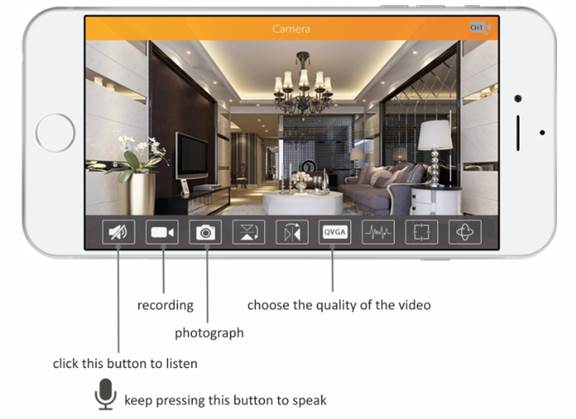 Step 3 : After setting the camera's WiFi connection successfully , you can view live video from the camera and use the functions of listening ,speaking and so on .