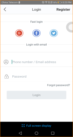 If you have registered the APP before, you can directly enter the account name (phone number or email) and password to login. If you do not have registered before, you can tap the “Register” on the upper right corner and follow the instruction to finish the process.