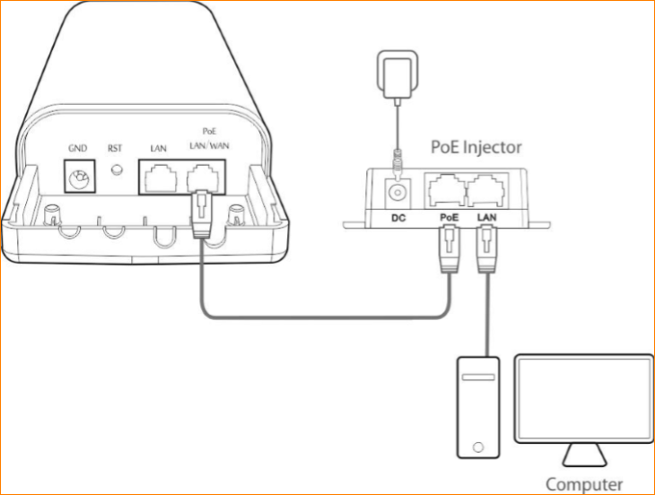 1.4 Connect your computer to the LAN port of the PoE injector.