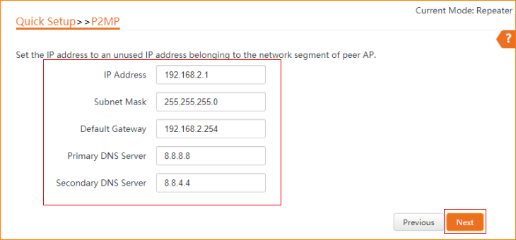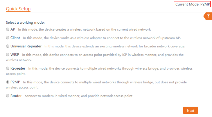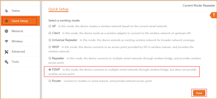 Note: This article will guide you how to setup P2MP mode and the steps as below. In this mode, the device connects to multiple wired networks through wireless bridge, but does not provide wireless access point.