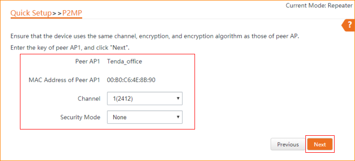 3.3 Ensure that the device uses the same channel, encryption, and encryption algorithm as those of peer AP. Enter the key of peer AP1, and click "Next".