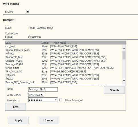 Select Enable and click Scanning , and then select wireless Router in WiFi List, enter its password, click Test to test the wireless settings. After testing successful, click Apply to save the wireless settings. Pull out network cable, then you can use the wireless function.