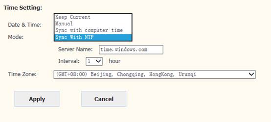 On web page,click SYSTEM > System Setting > Time setting to set manually .After setting the time, click Apply to save the settings.