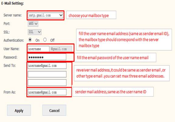 When motion detection alarm is triggered, it can send email to your appointed email box. But you need to set email service parameters correctly first. Below is email setting example for your reference.